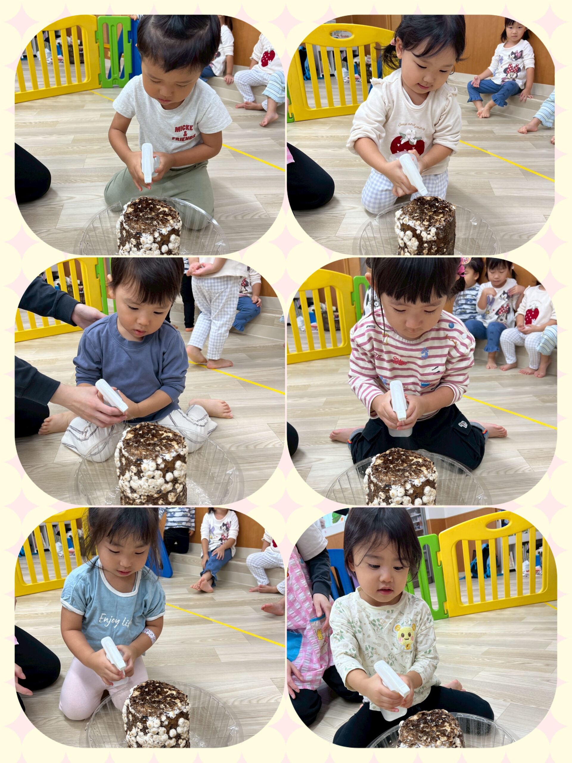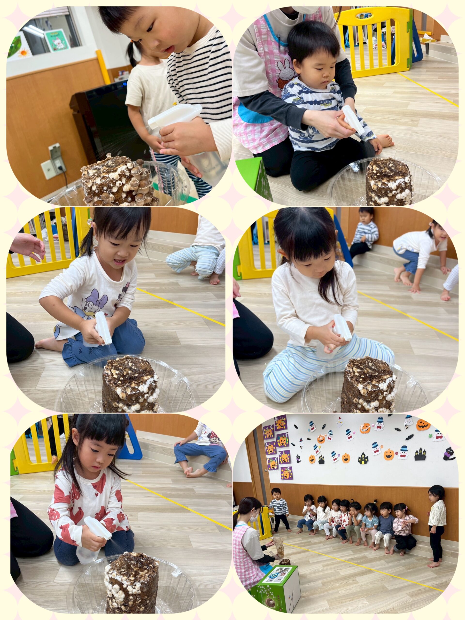 朝晩と日中の気温差が大きく、すっかり秋ですね🍁 登園している子どもたちは、とっても元気いっぱいです😆‼️ そんなきりん組さんの最近の様子をお見せします☺️💖 食育の一環としてしいたけの栽培をはじめました😄‼️ 毎日お当番さんがお水をあげてくれているので、 どんどん大きくなっているしいたけに大喜び🥰✨ 明日も元気にあそぼうね😉💖