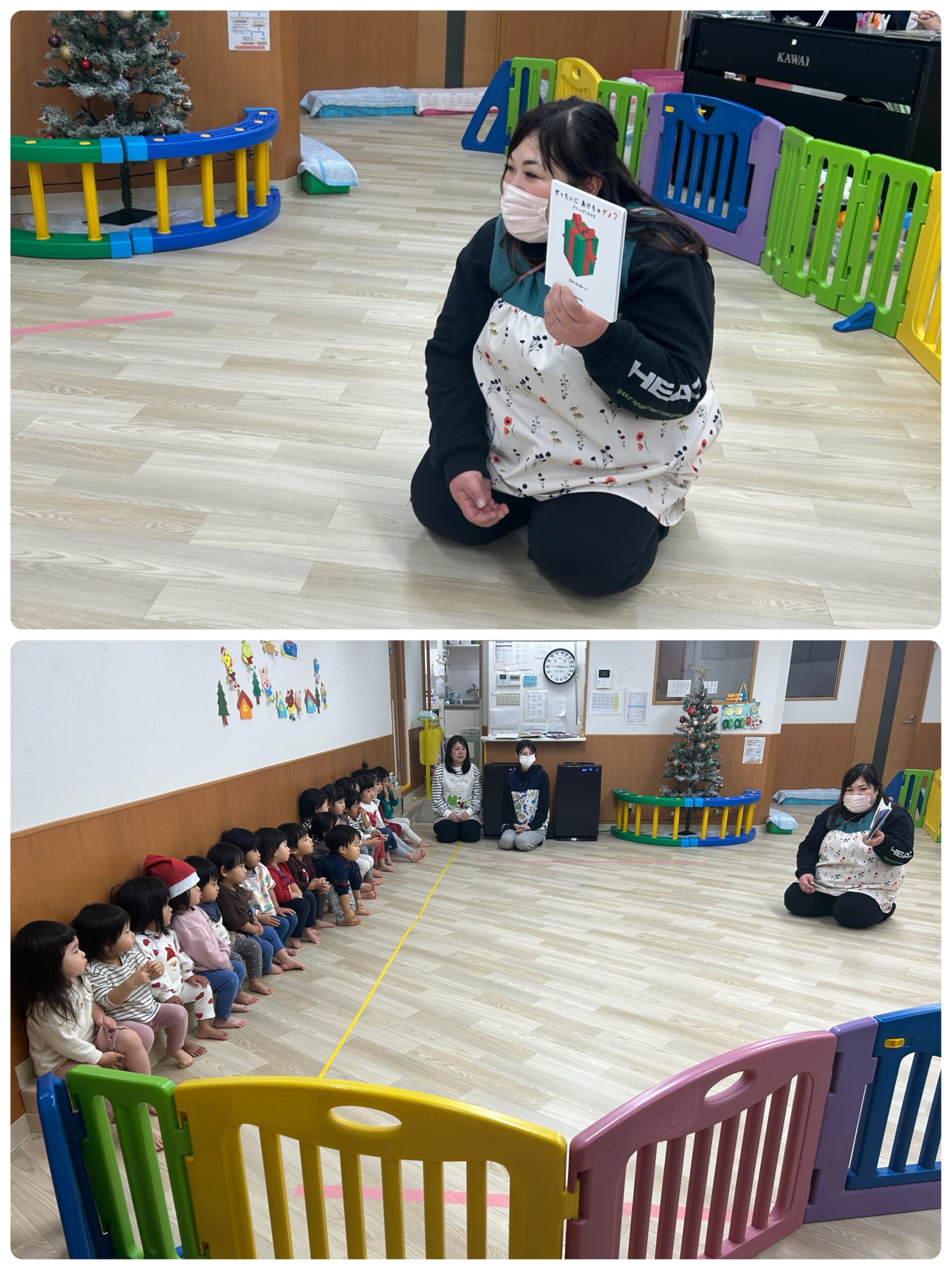最初はクリスマスのお話を聞き、「絶対にあけちゃダメ?ラリーのクリスマス」の絵本を見ました。