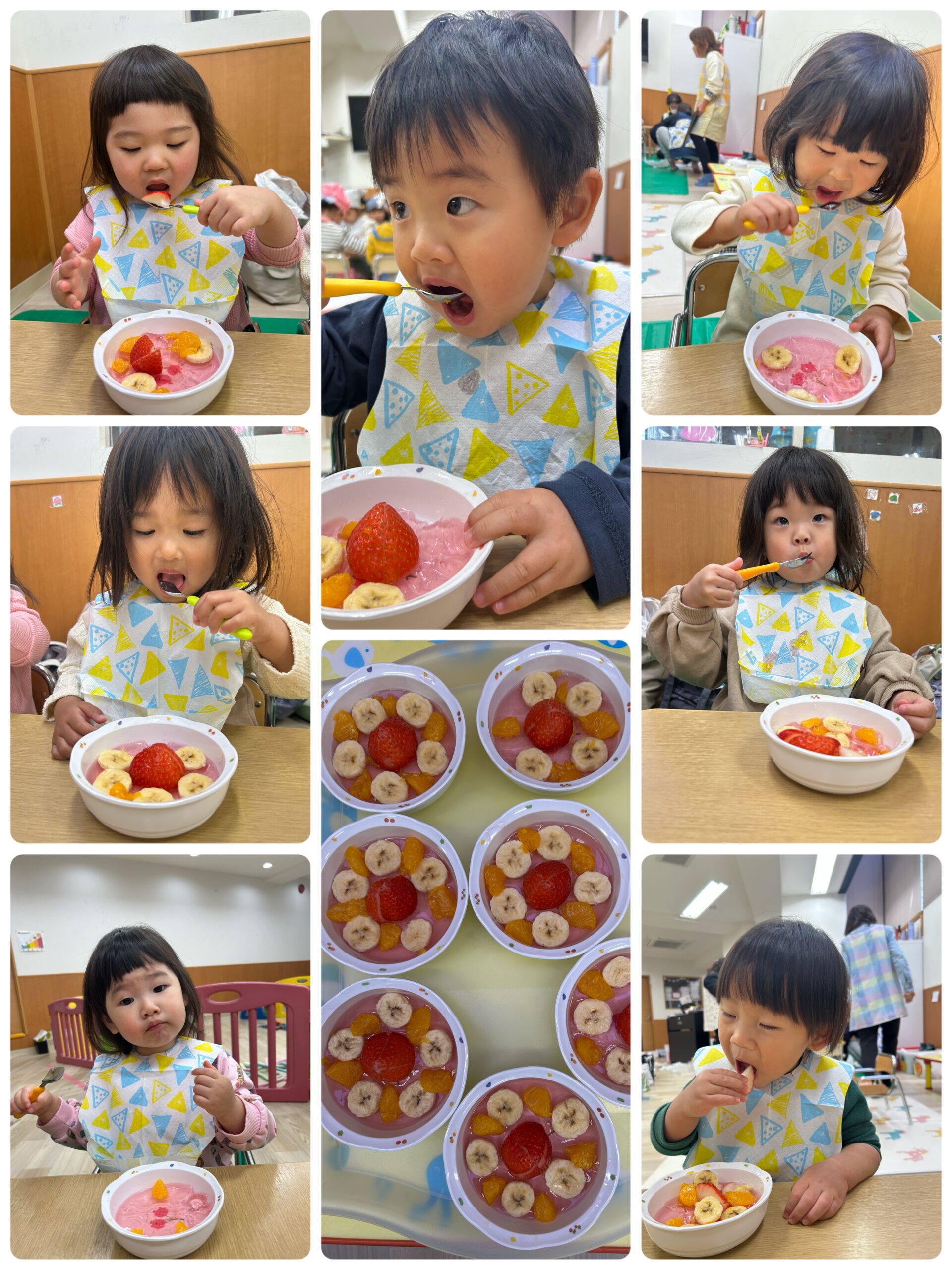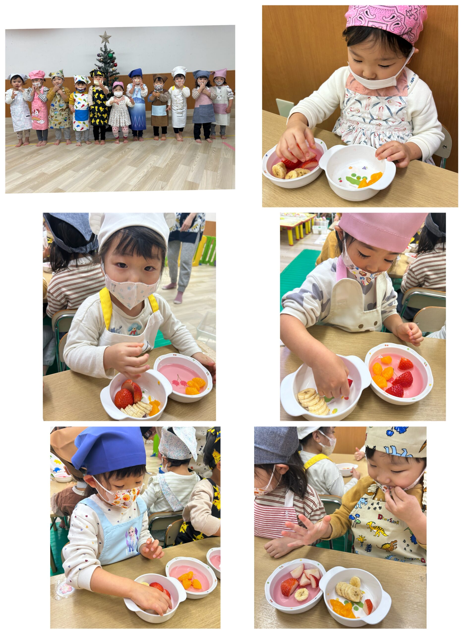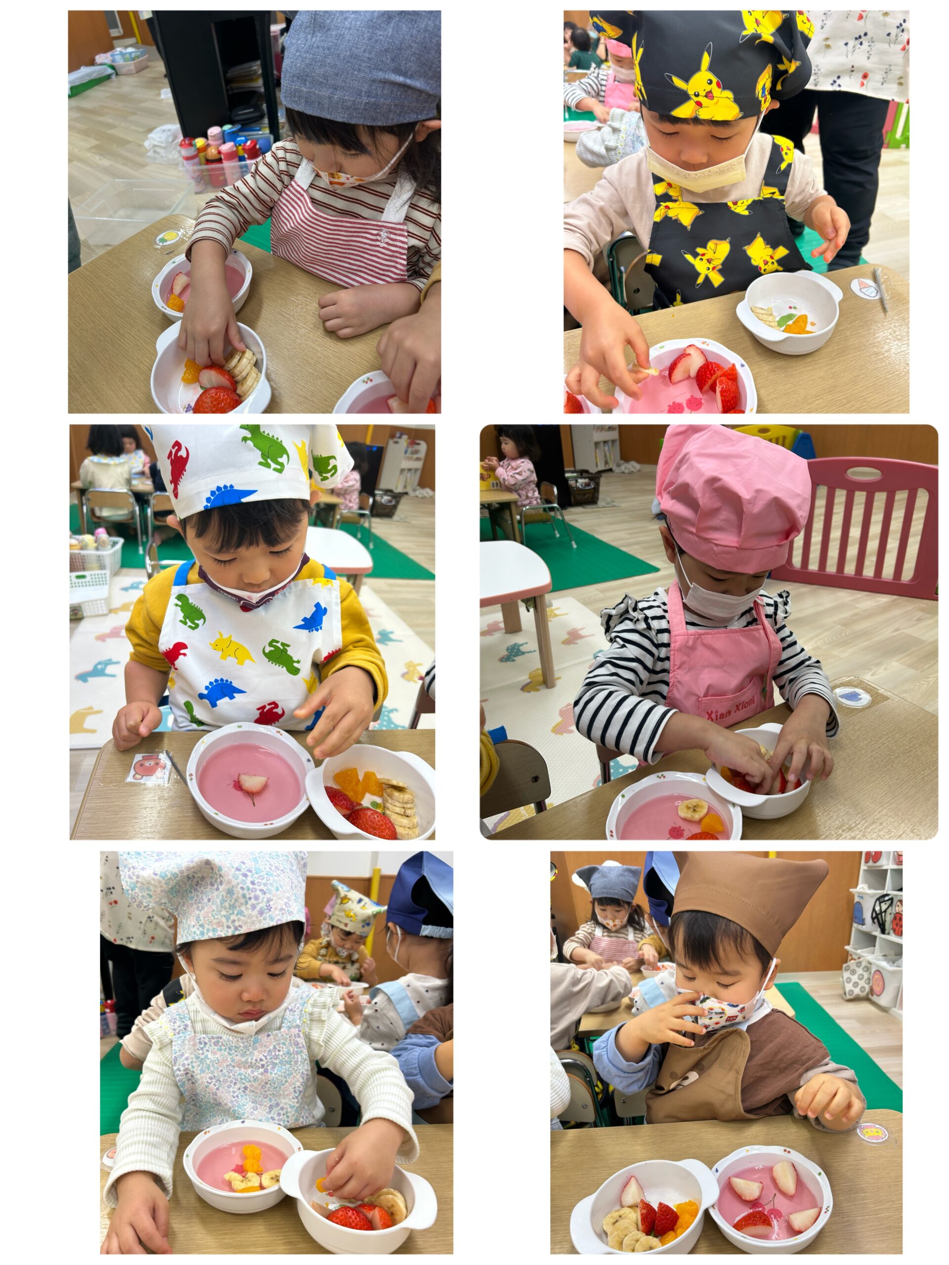 いちご寒天ゼリーにみかん、バナナ、イチゴをきりん組さんは自分で飾りつけ!