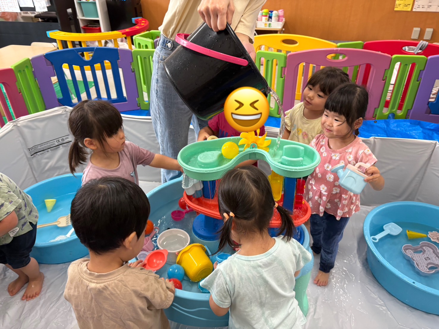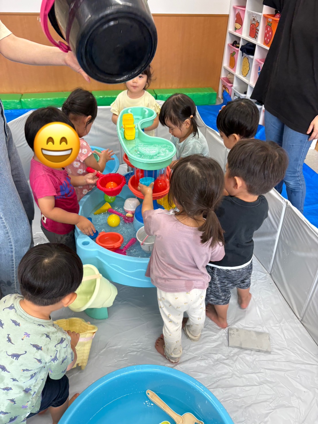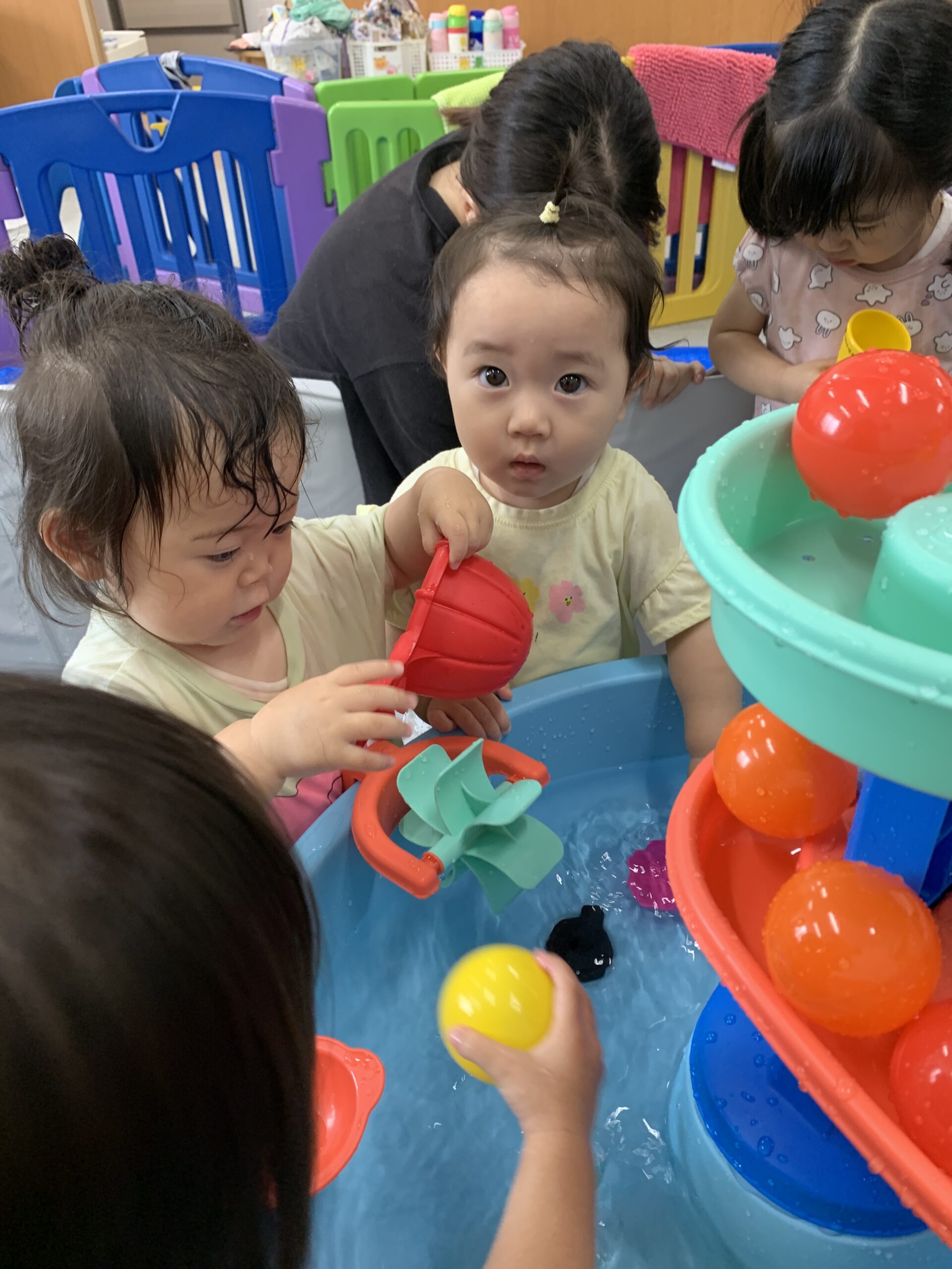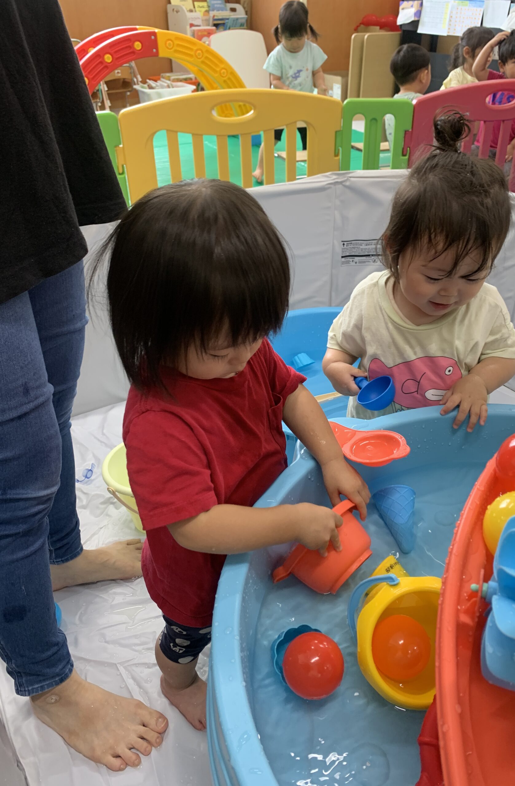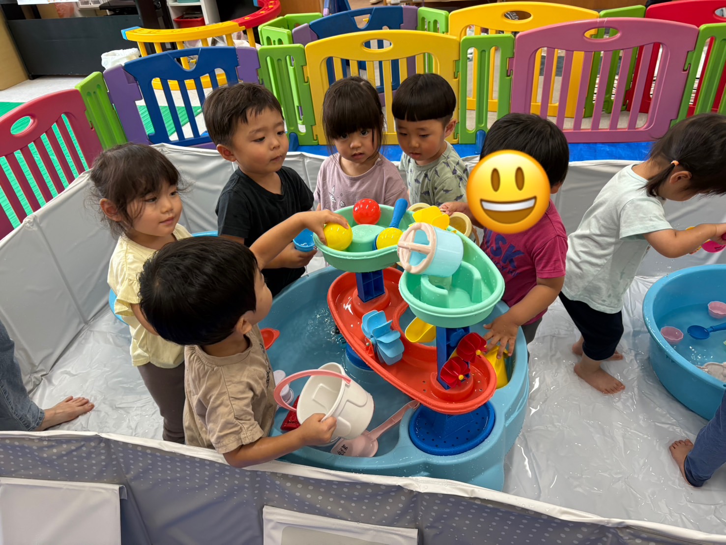 待ってました!と水を触りに行き水がかかっても全く動じないお友だちや、まずは様子をうかがいながら少しずつ水に触れてみるお友だちと様々な姿が見られました😄