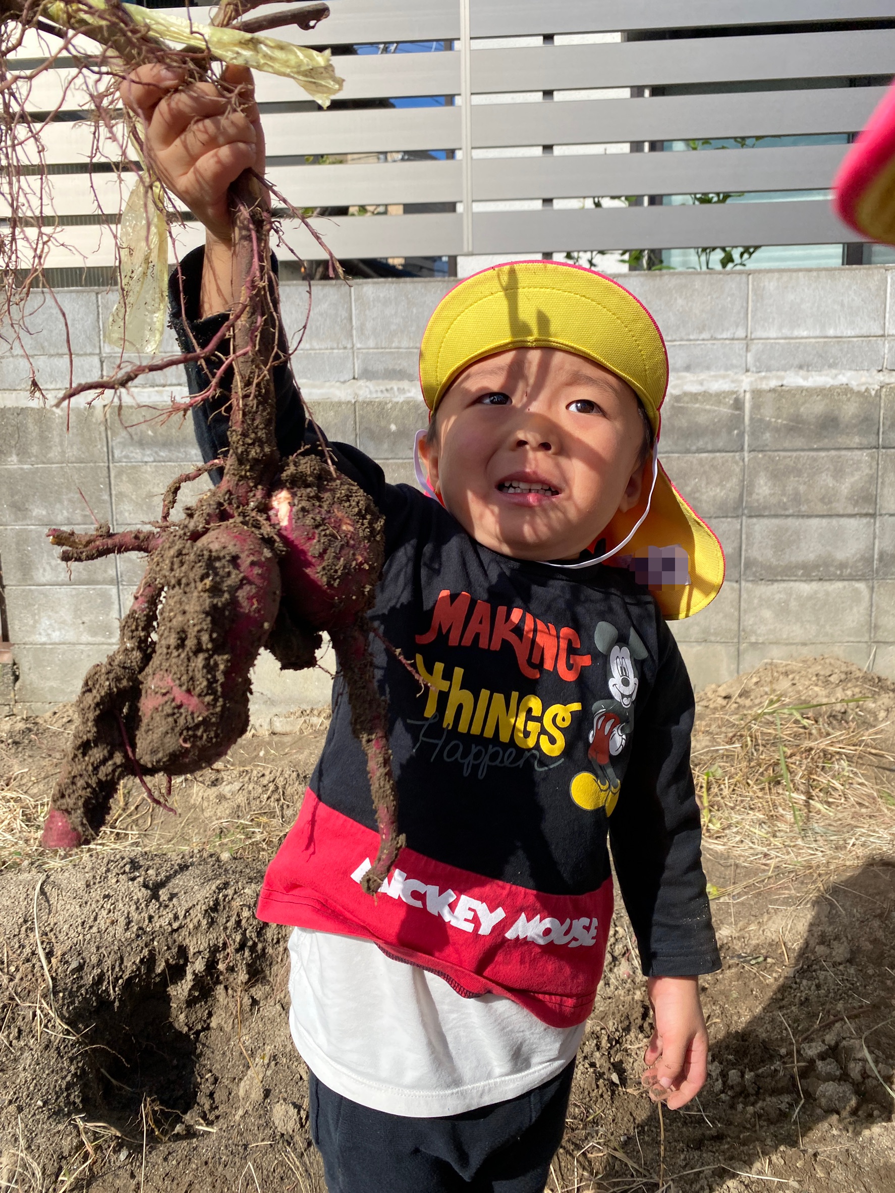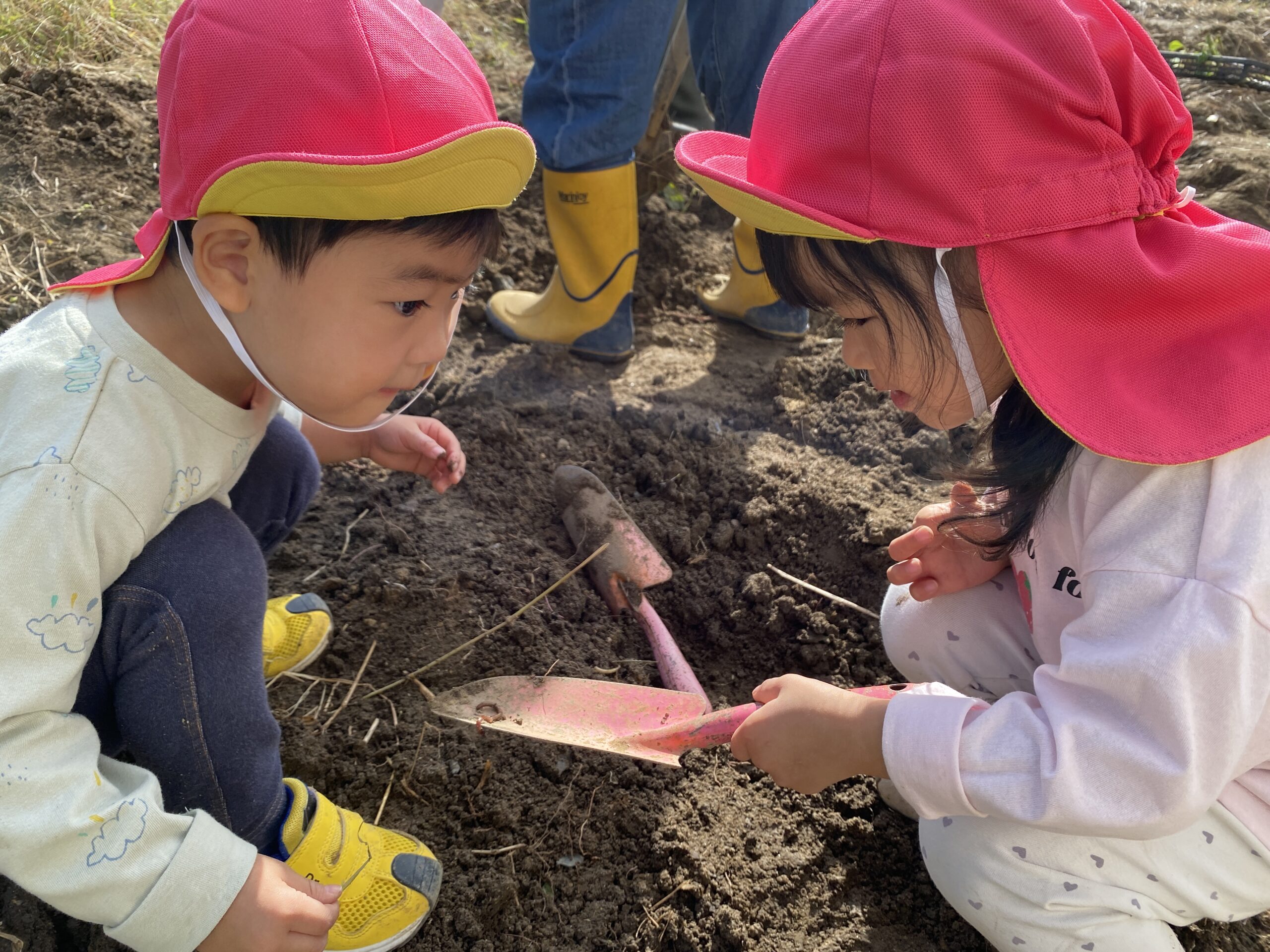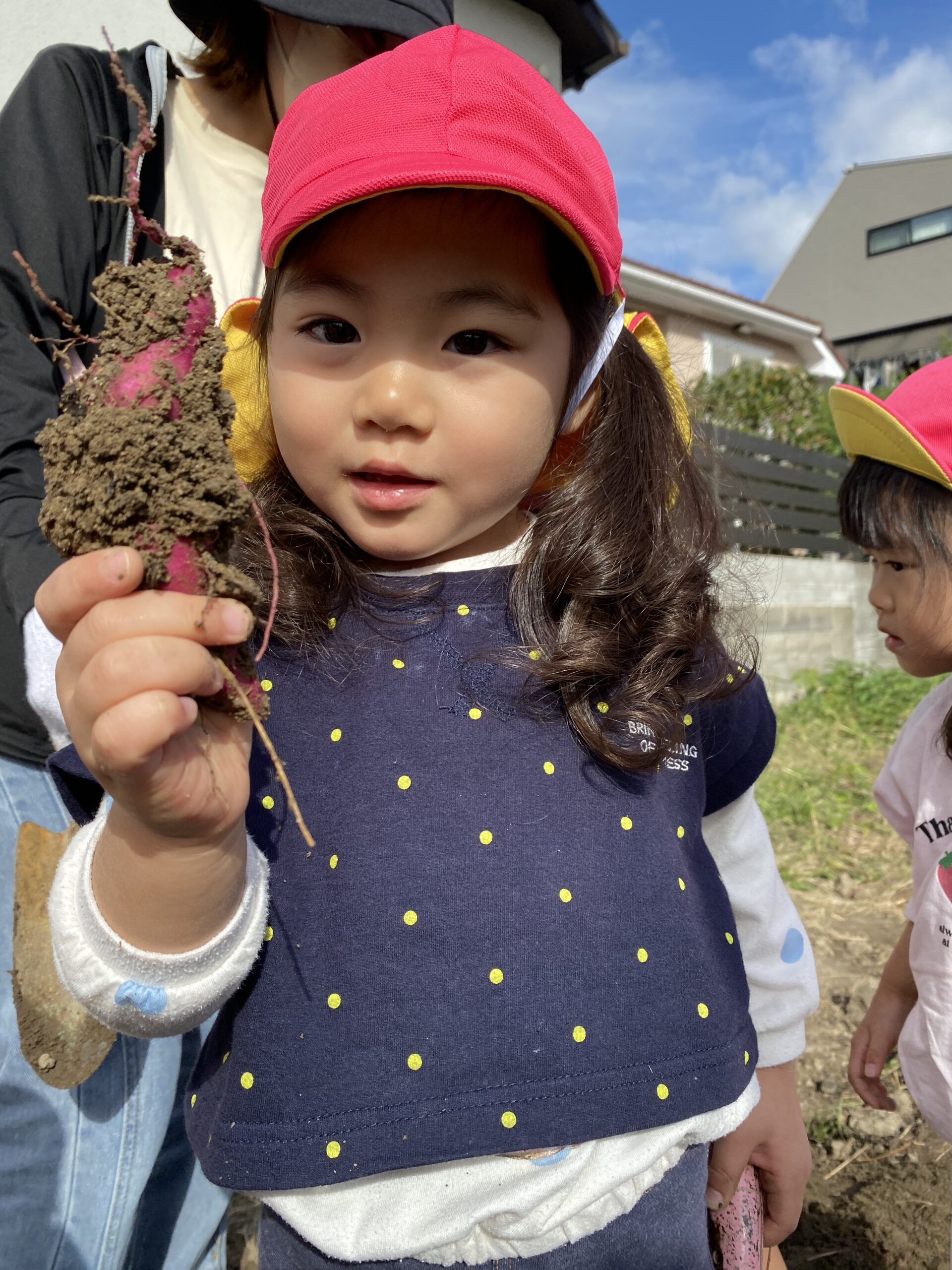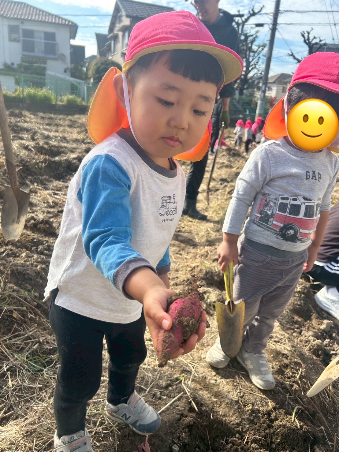 きりん組さんは、お芋ほりに挑戦しました✨ 畑に到着! 早速、土を掘ります♪ ミミズさんも発見‼ 『これはニンニクが出来るんだよ~』と、ニンニクの肥料となる籾殻を見せていただきました😄 土の匂いや感触を感じながらお芋を掘ったり、虫を見つけて触ってみたり… たくさんの経験をしたきりん組さんでした♪ 最後に千里山さんと♡ 楽しかったね😄 芋ほり♬