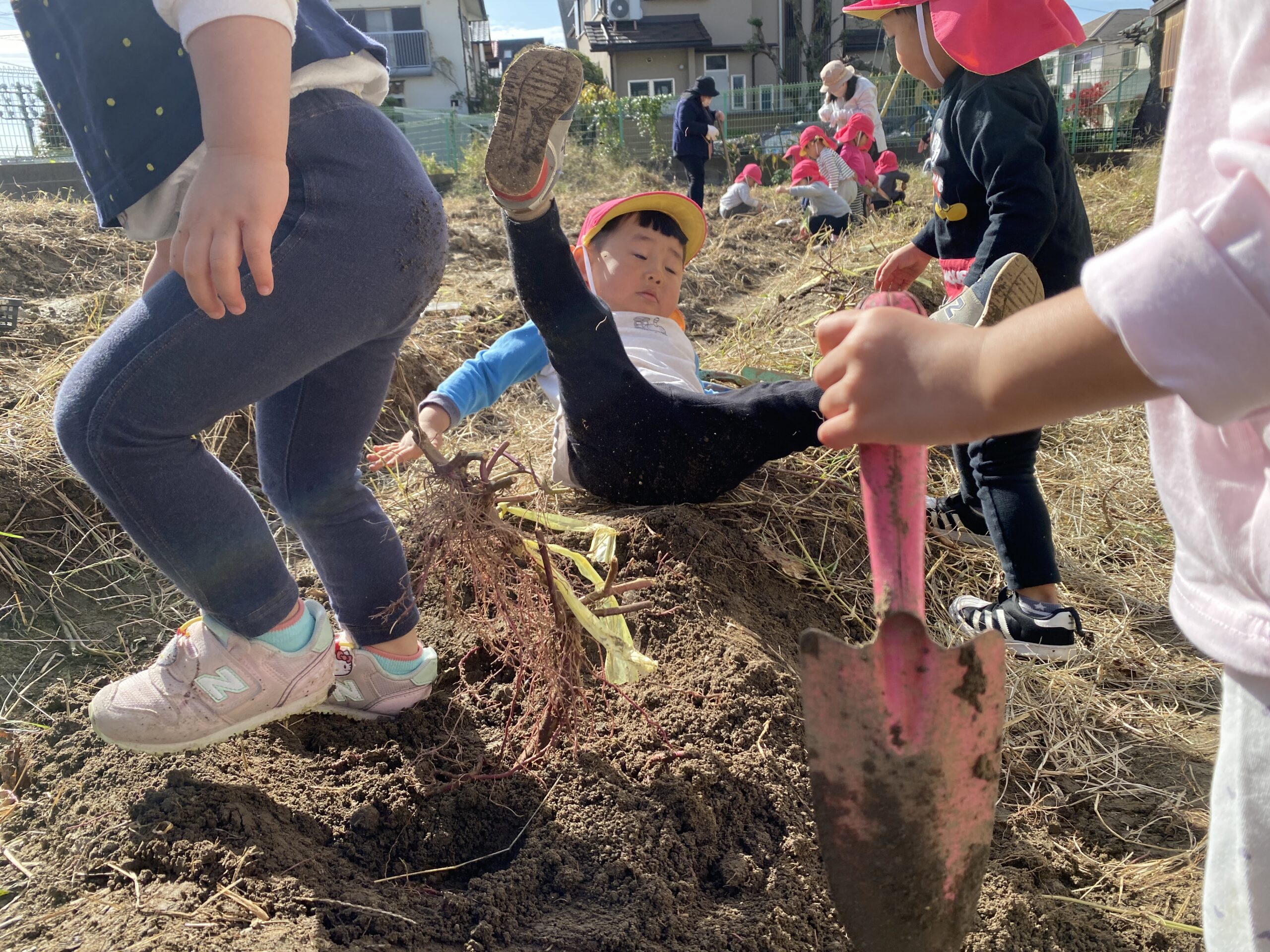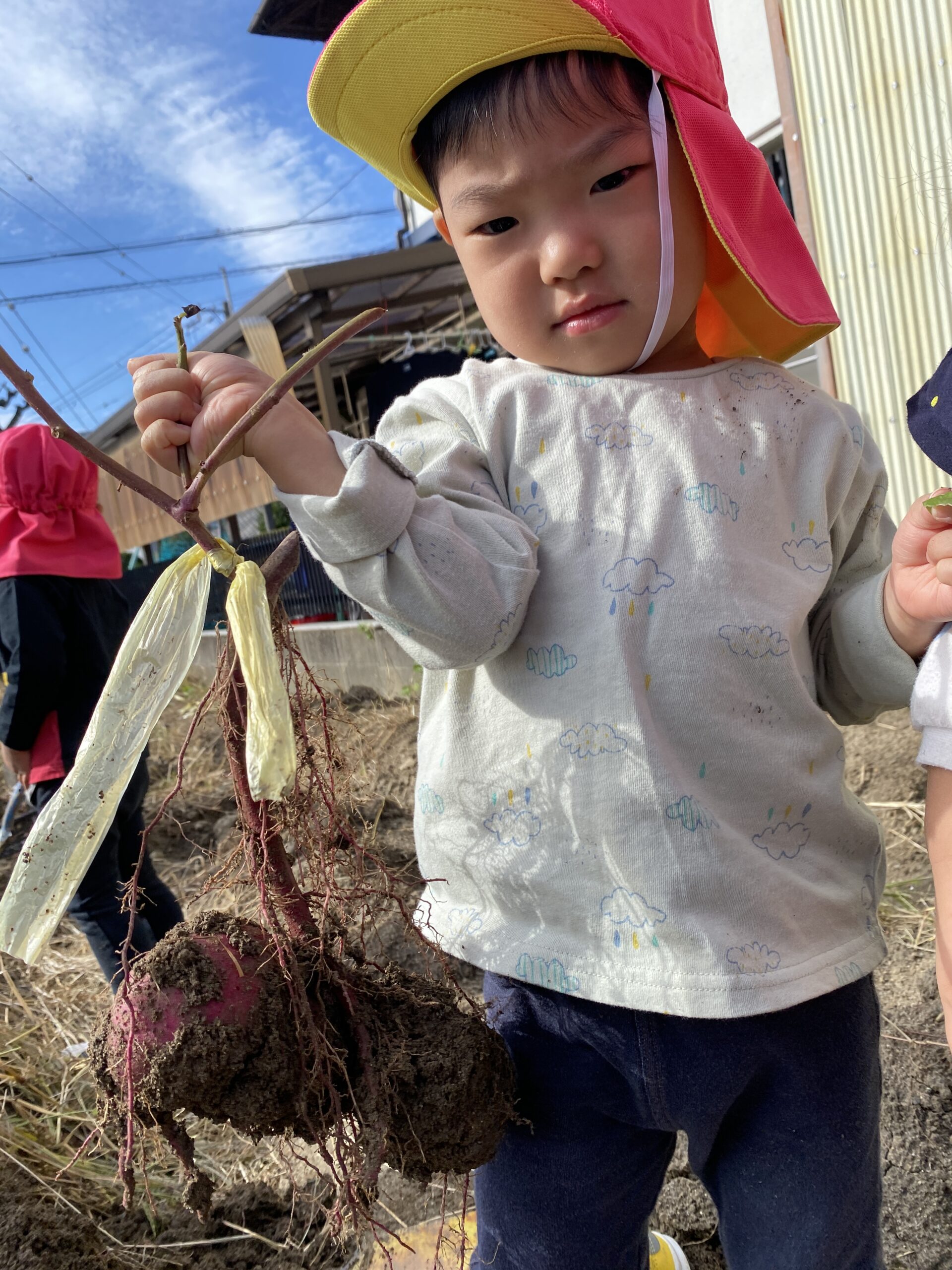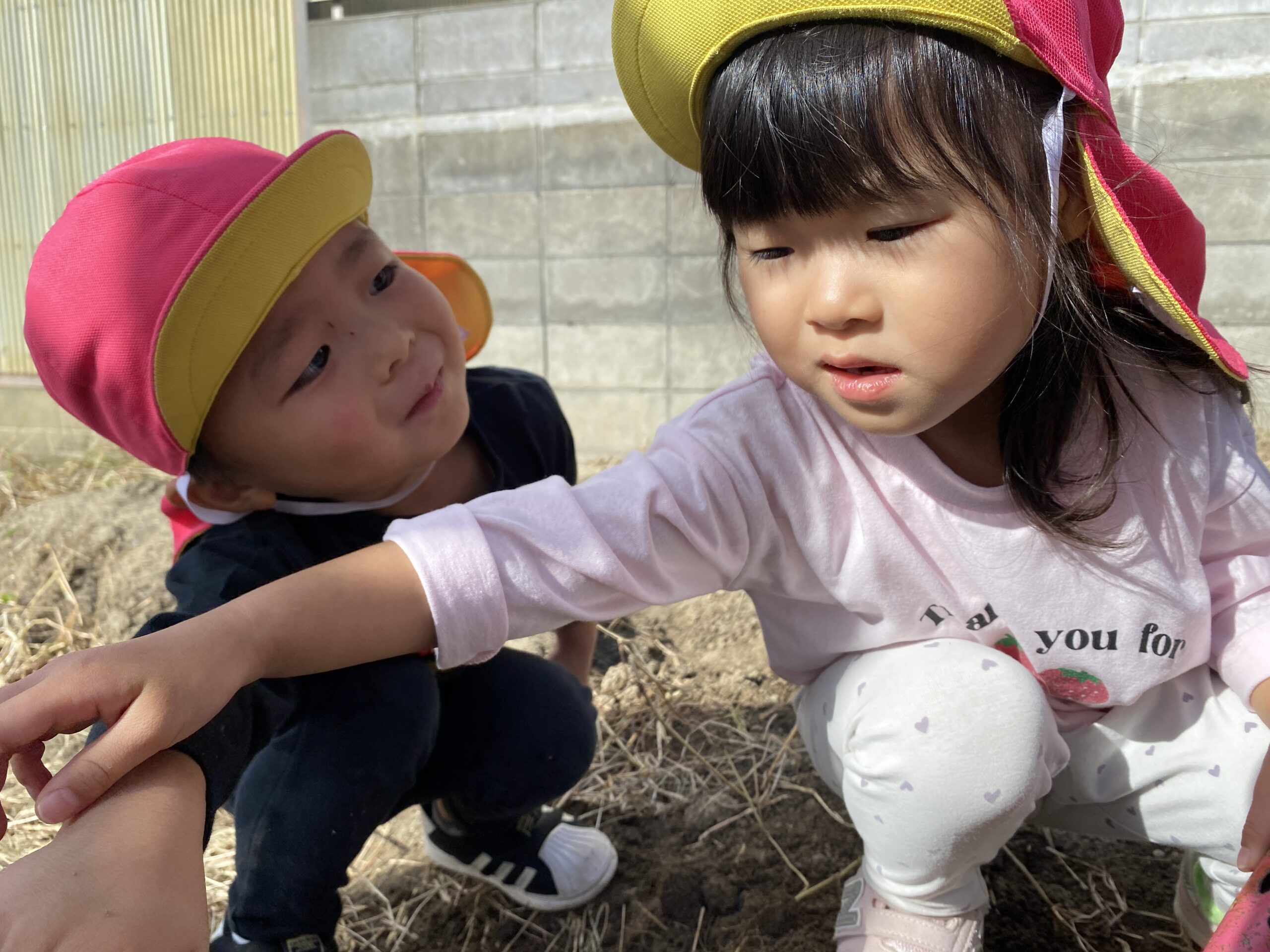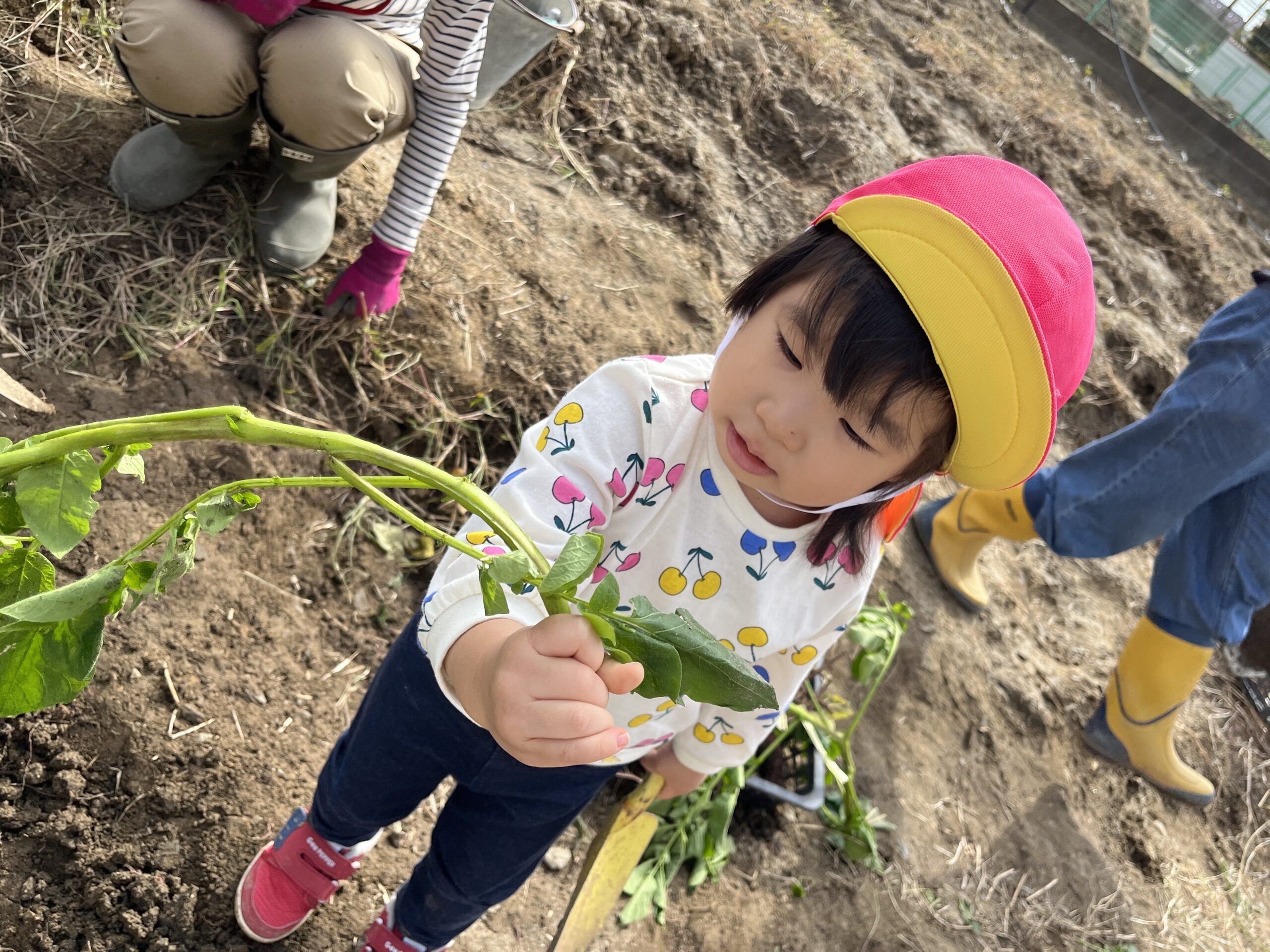 きりん組さんは、お芋ほりに挑戦しました✨ 畑に到着! 早速、土を掘ります♪ ミミズさんも発見‼ 『これはニンニクが出来るんだよ~』と、ニンニクの肥料となる籾殻を見せていただきました😄 土の匂いや感触を感じながらお芋を掘ったり、虫を見つけて触ってみたり… たくさんの経験をしたきりん組さんでした♪ 最後に千里山さんと♡ 楽しかったね😄 芋ほり♬