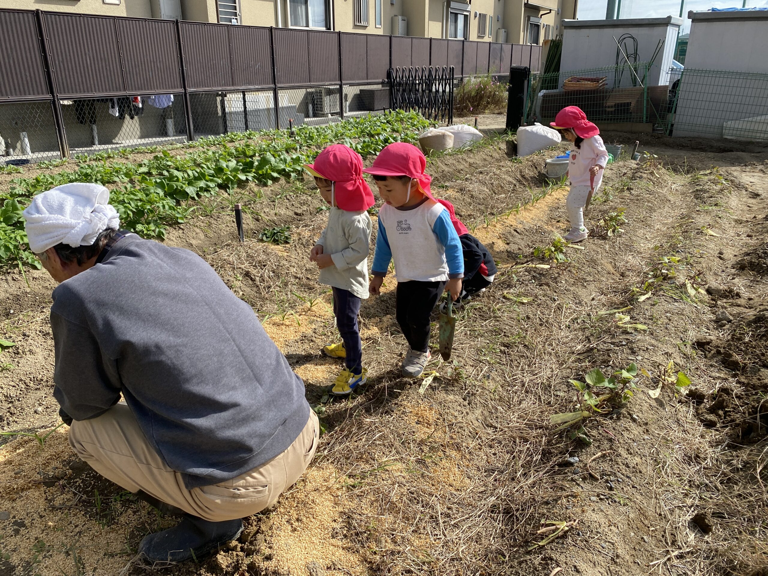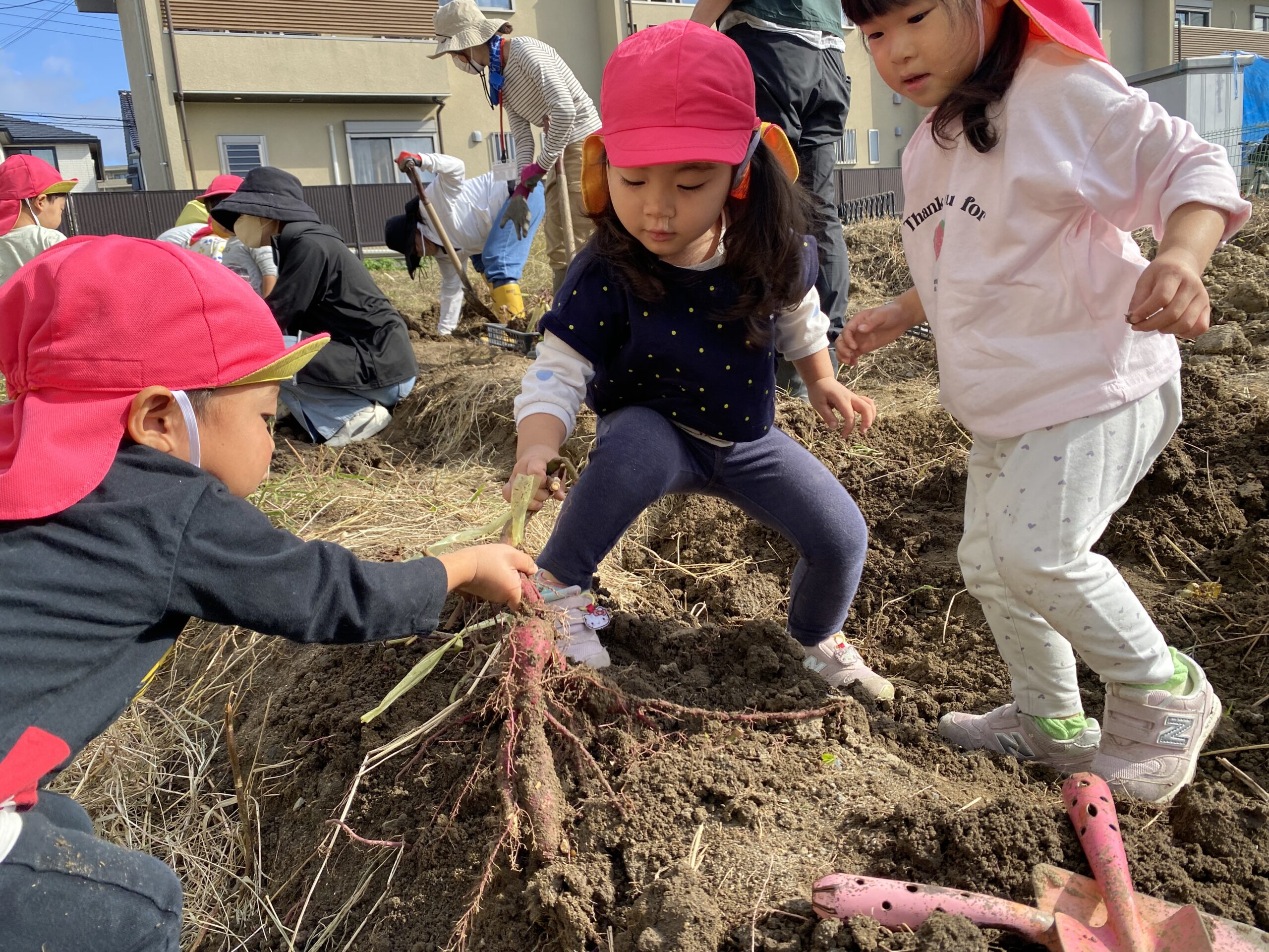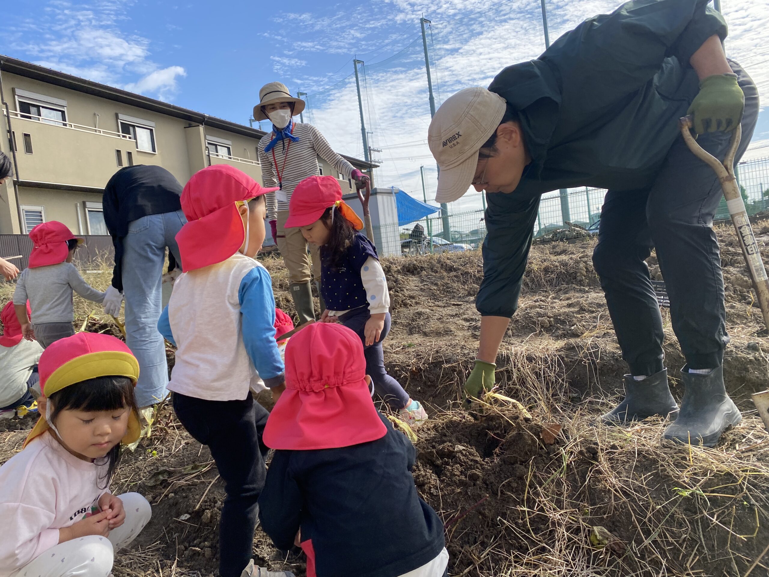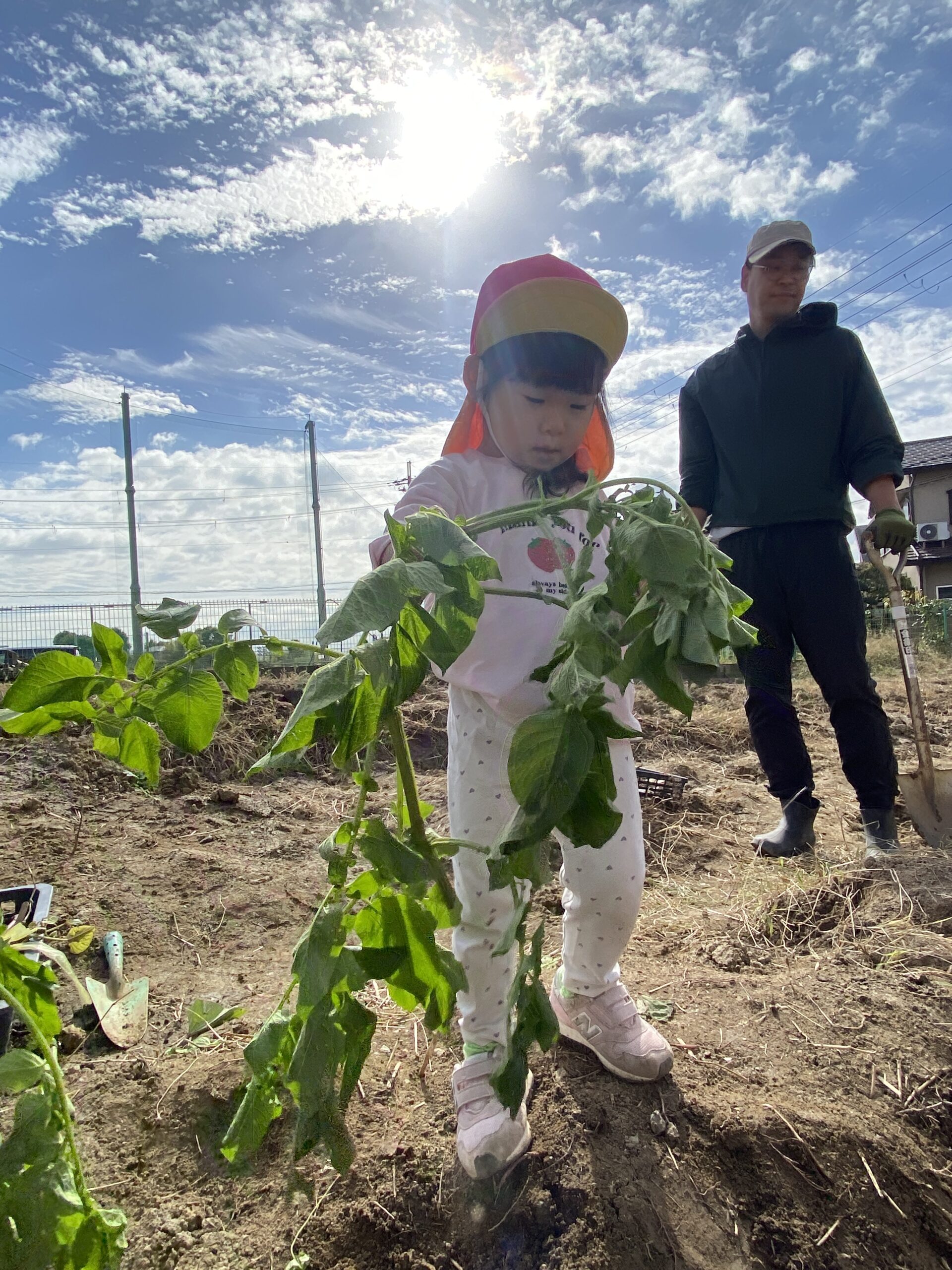 きりん組さんは、お芋ほりに挑戦しました✨ 畑に到着! 早速、土を掘ります♪ ミミズさんも発見‼ 『これはニンニクが出来るんだよ~』と、ニンニクの肥料となる籾殻を見せていただきました😄 土の匂いや感触を感じながらお芋を掘ったり、虫を見つけて触ってみたり… たくさんの経験をしたきりん組さんでした♪ 最後に千里山さんと♡ 楽しかったね😄 芋ほり♬
