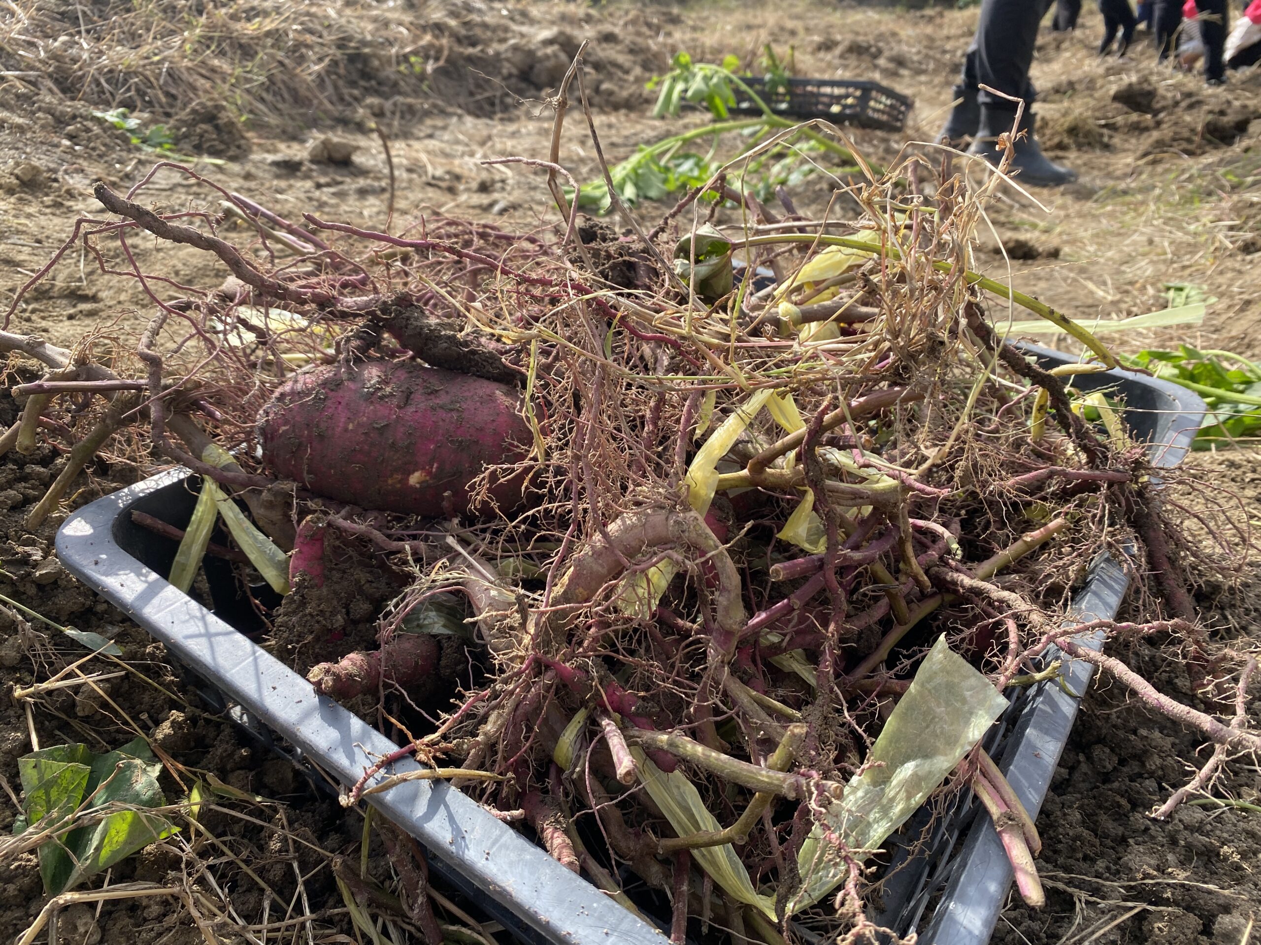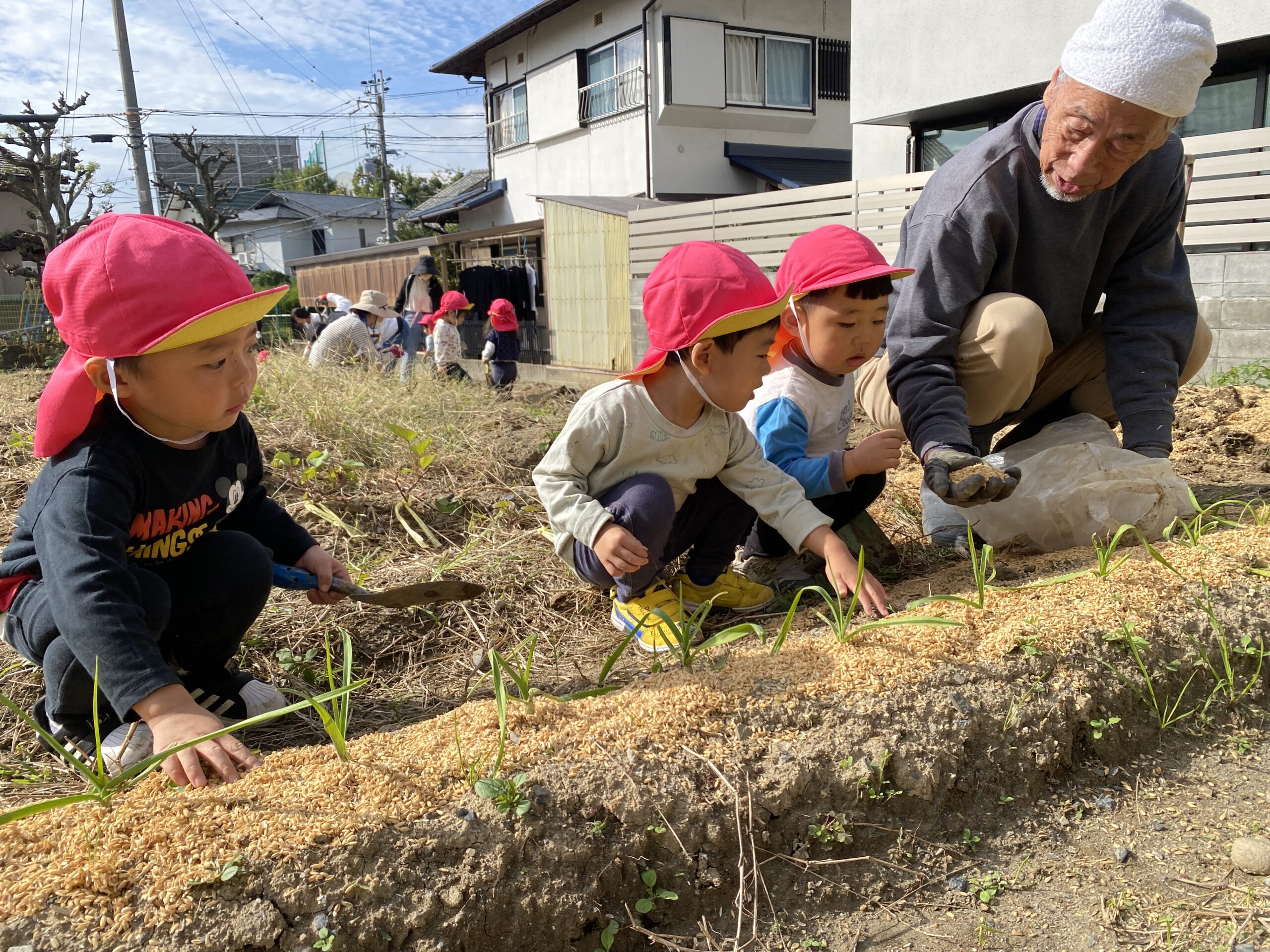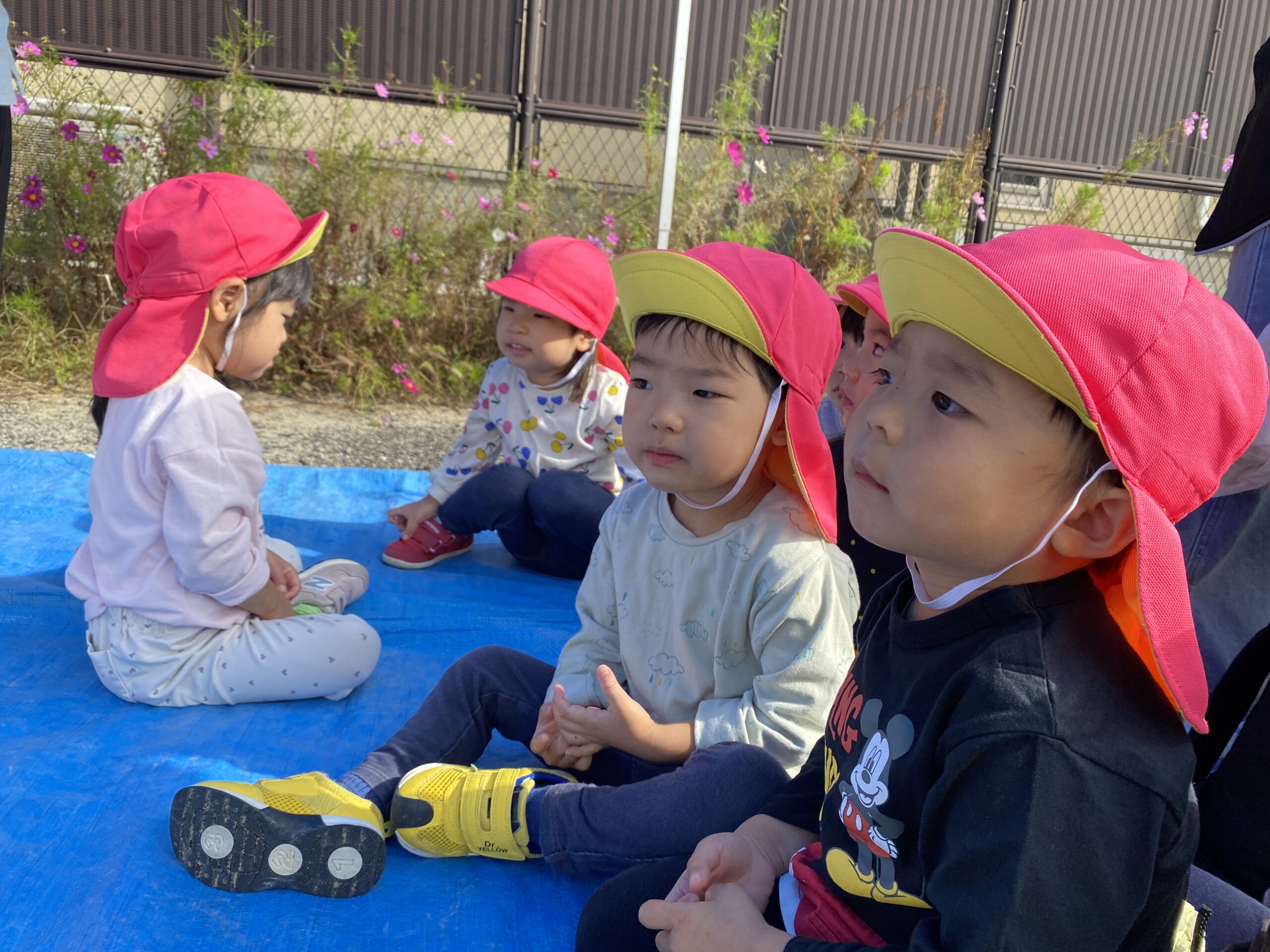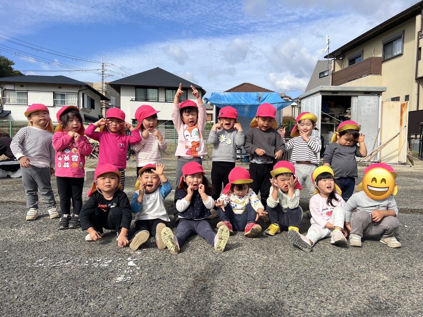きりん組さんは、お芋ほりに挑戦しました✨ 畑に到着! 早速、土を掘ります♪ ミミズさんも発見‼ 『これはニンニクが出来るんだよ~』と、ニンニクの肥料となる籾殻を見せていただきました😄 土の匂いや感触を感じながらお芋を掘ったり、虫を見つけて触ってみたり… たくさんの経験をしたきりん組さんでした♪ 最後に千里山さんと♡ 楽しかったね😄 芋ほり♬