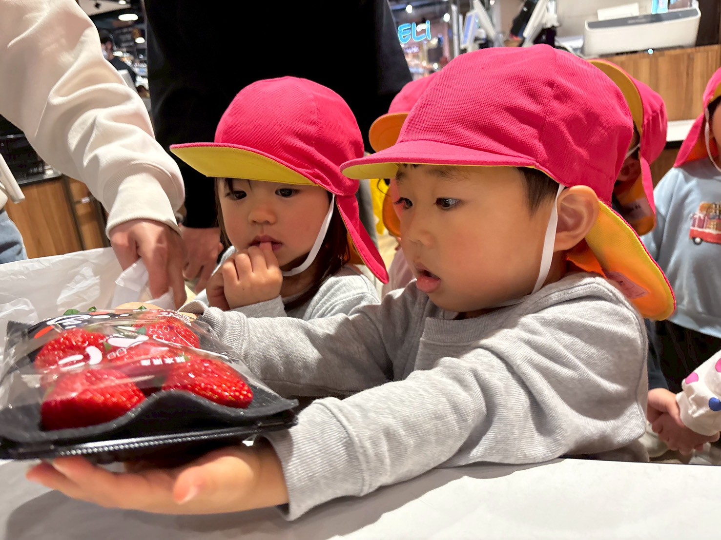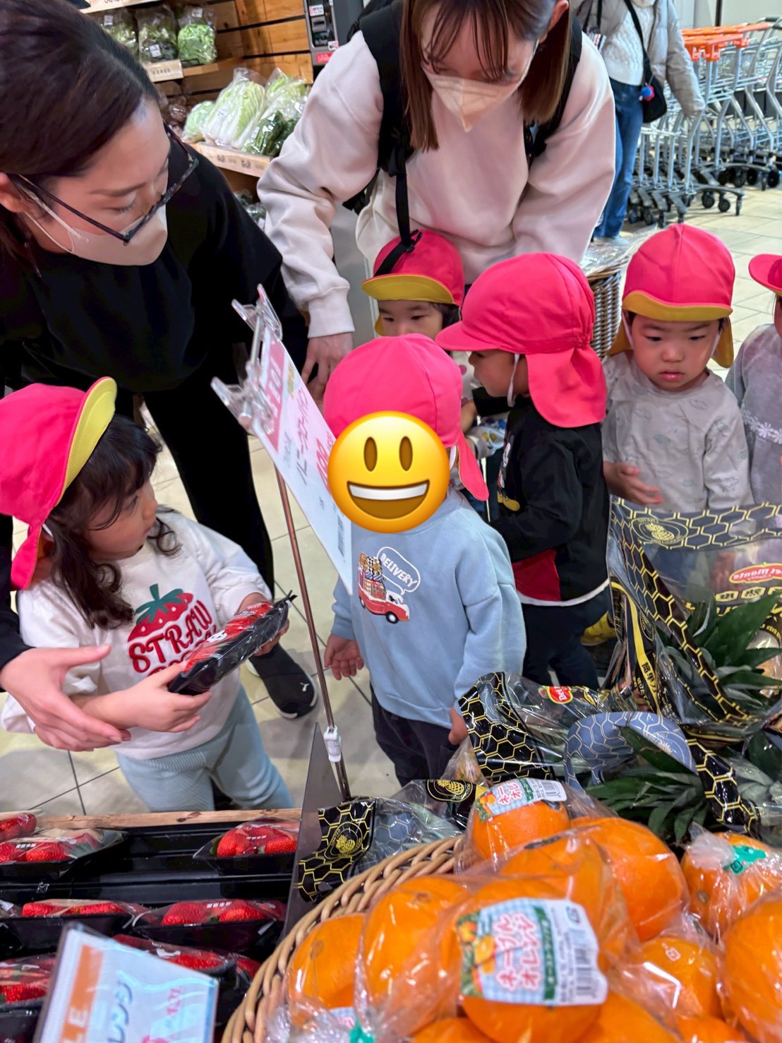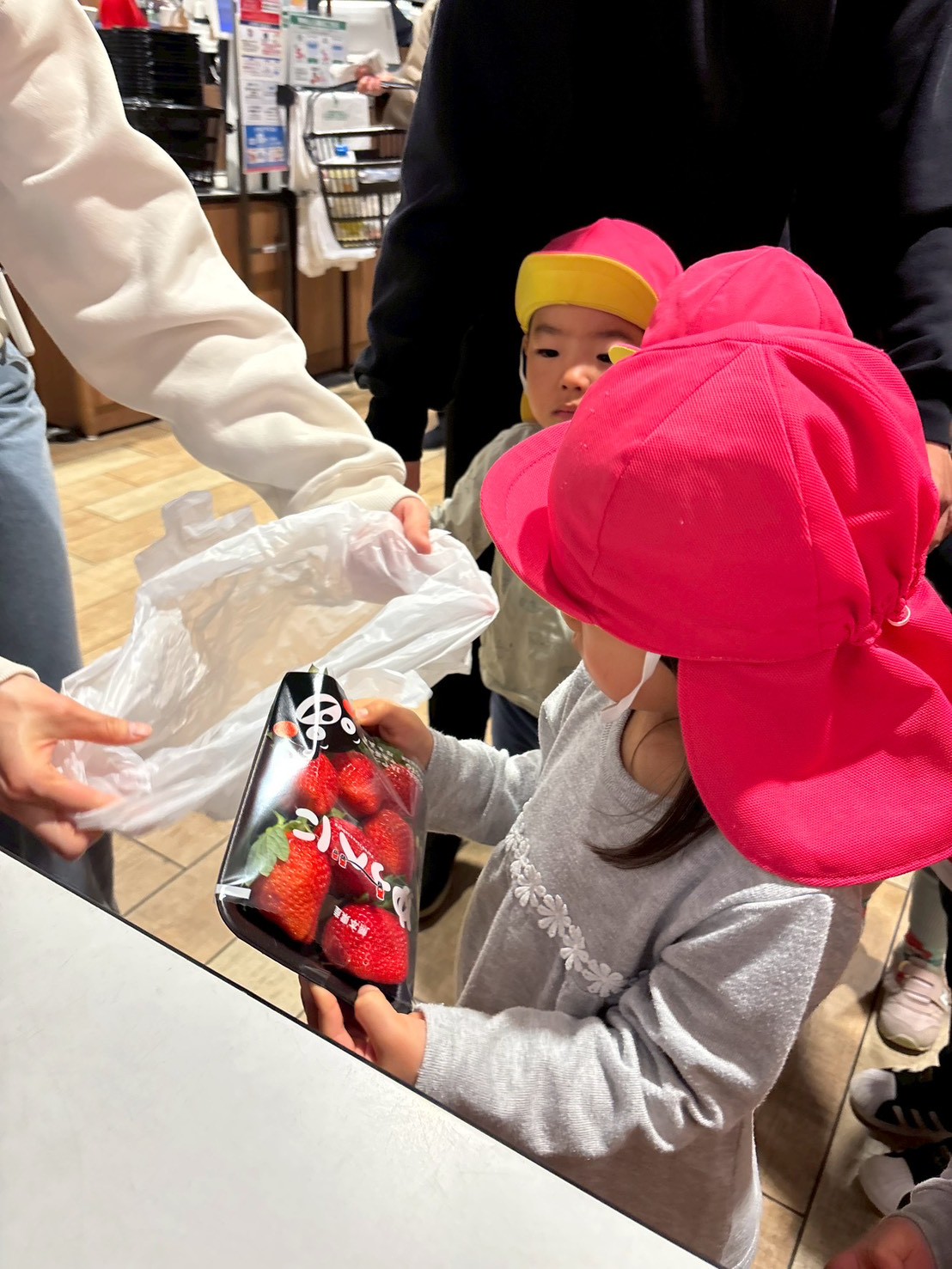 「いちご買うんだよ!」「お寿司もほしい!」「お寿司買わないよ~💦」「チキンあるかな?」とお話が止まらないきりん組さん。