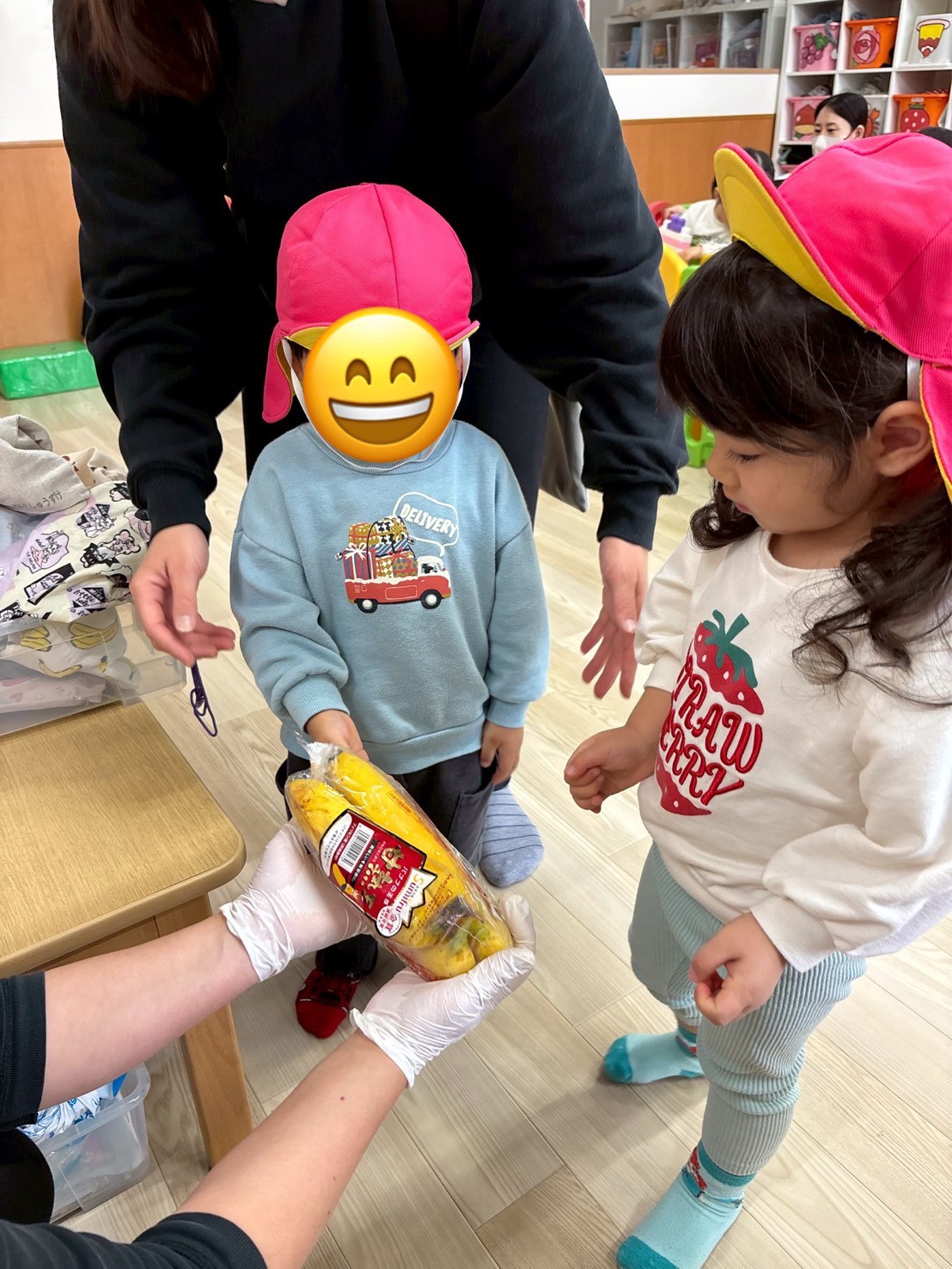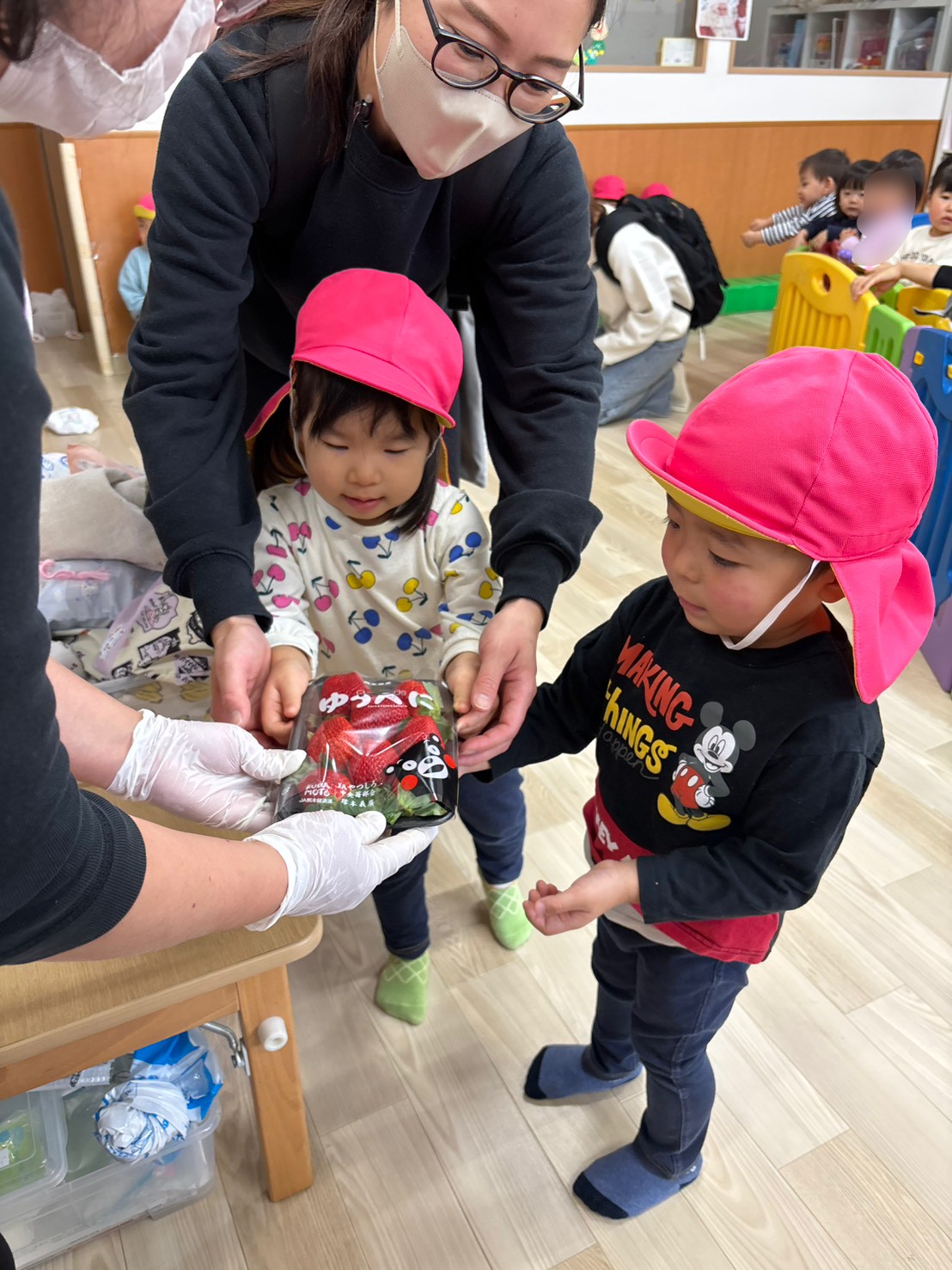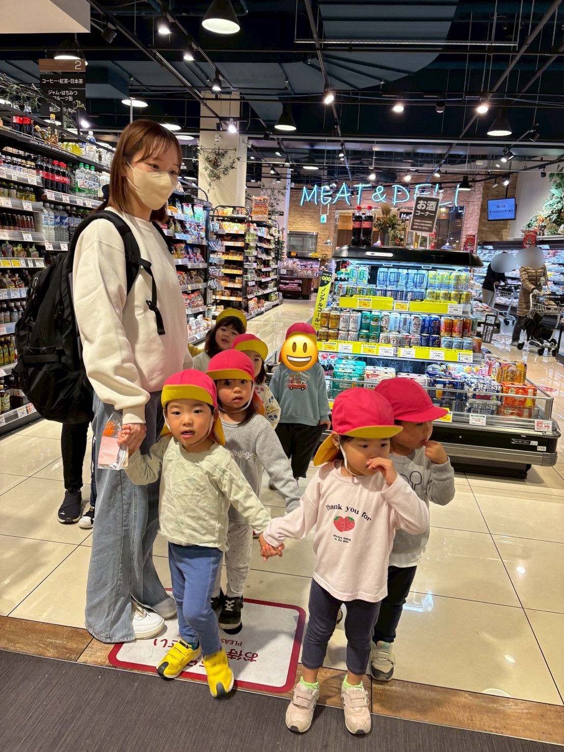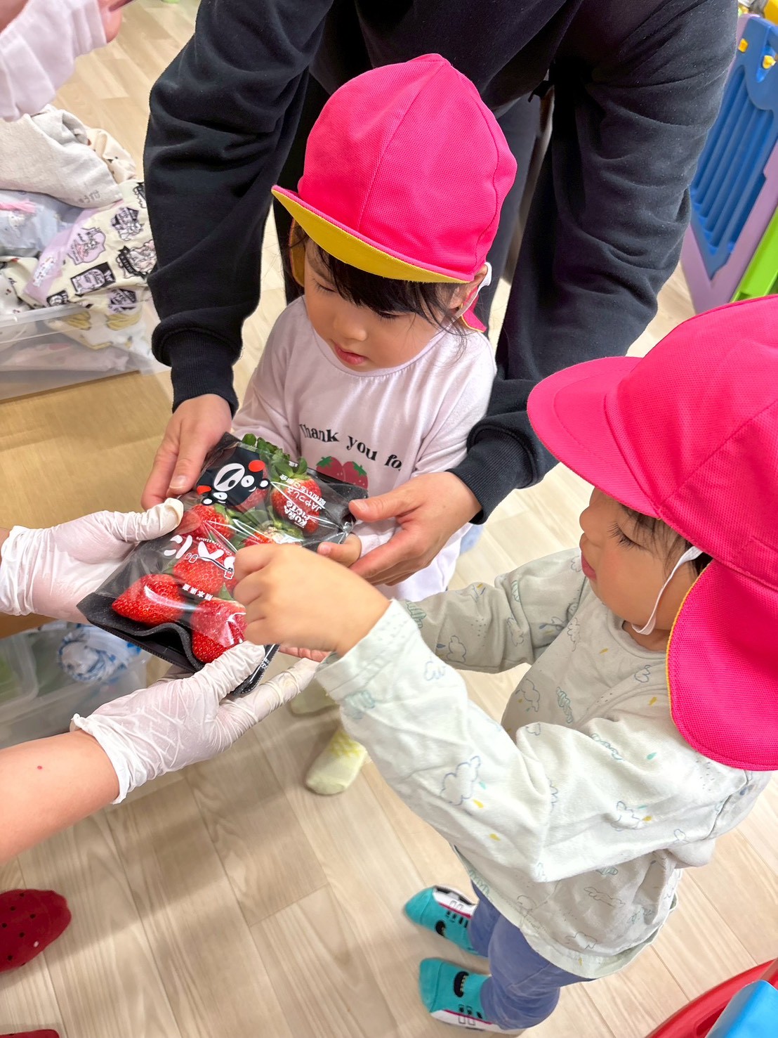 「いちご買うんだよ!」「お寿司もほしい!」「お寿司買わないよ~💦」「チキンあるかな?」とお話が止まらないきりん組さん。