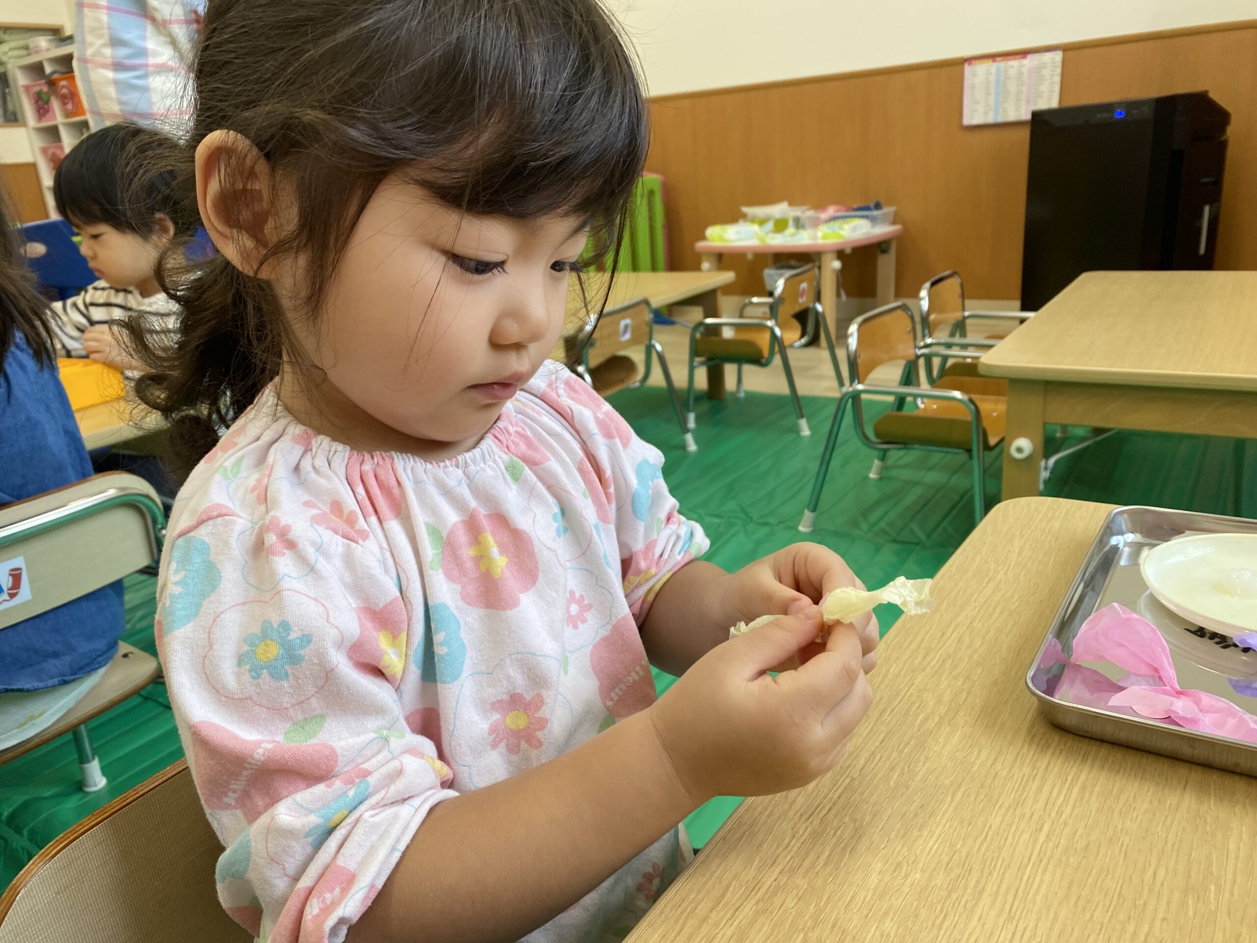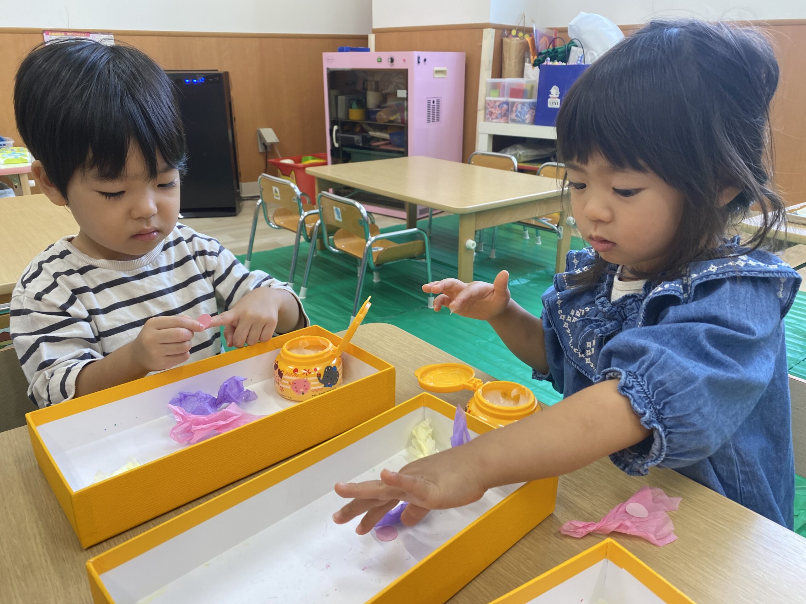 10月最後の週が始まりました♪ 今週はハロウィンパーティーがあり、仮装が楽しみです🎃🎃 さて、きりん組さんはハロウィン製作の続きをしていたのでその様子を少しだけ…✨ 今日はのりを使うそうです! 『指先にのりをつけてね!』と先生から説明がありました♪ お話をよく聞いていたきりん組さん👏 完成が楽しみです‼