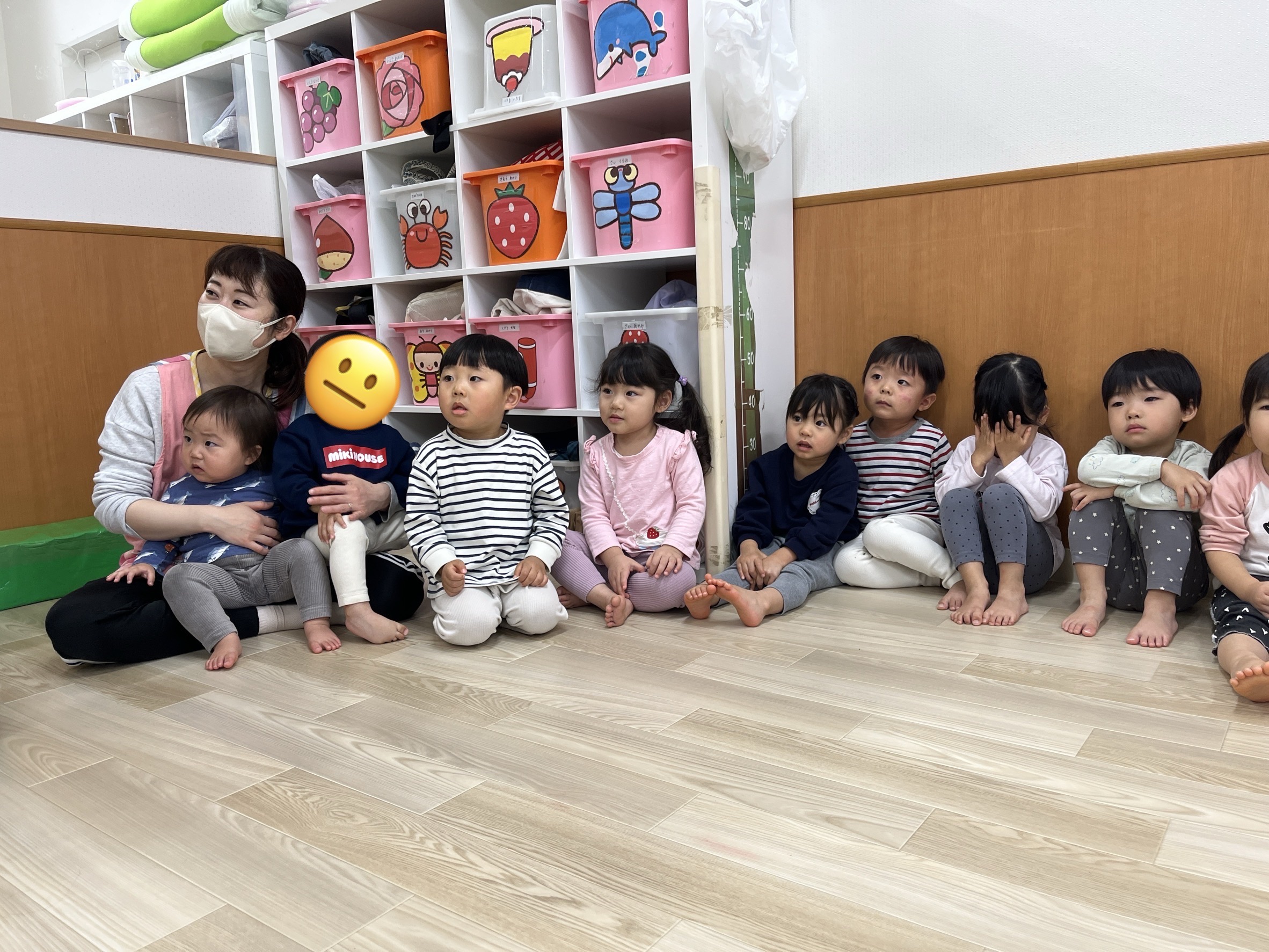 突然の登場にびっくりしているお友だちやドキドキして先生のそばから離れないお友だちもいましたが…
