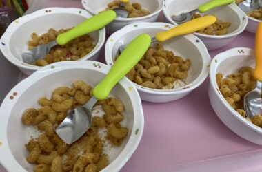 3時のおやつは…🎵 子どもたちに、とっても人気な“マカロニきな粉”✨ お皿ぴっ…