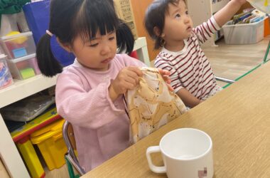 大好きな給食の時間です! 給食の準備をがんばっているりす組さん✨ 出来ることがどんどん増えて…